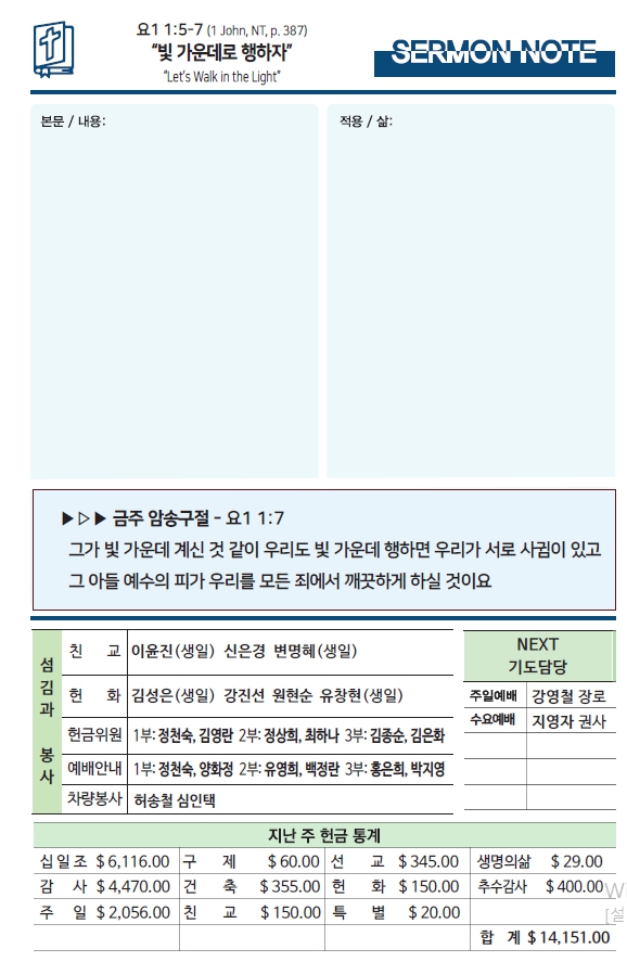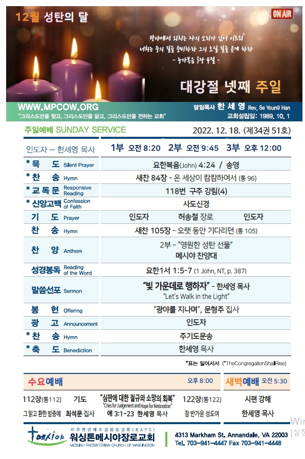 Bulletin 교회주보 [2022-12-18] 주보 Author Pastor MPC Date 2022-12-17 10:48 Views 1093 Like 0 Unlike 0 Print « [2022-12-11] 주보 [2022-12-25] 주보 » List