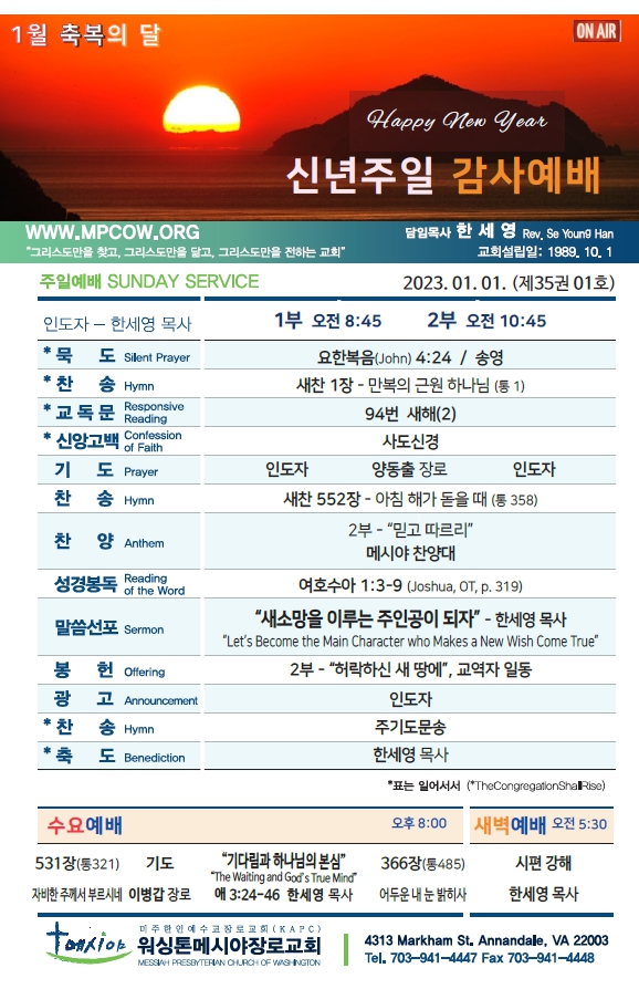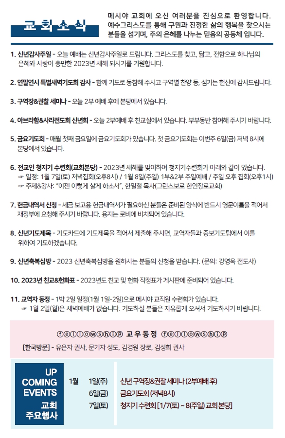 Bulletin 교회주보 [2023-01-01] 주보 Author Pastor MPC Date 2022-12-31 16:24 Views 1125 Like 0 Unlike 0 Print « [2022-12-25] 주보 [2022-01-08] 주보 » List