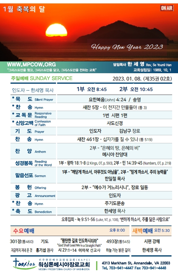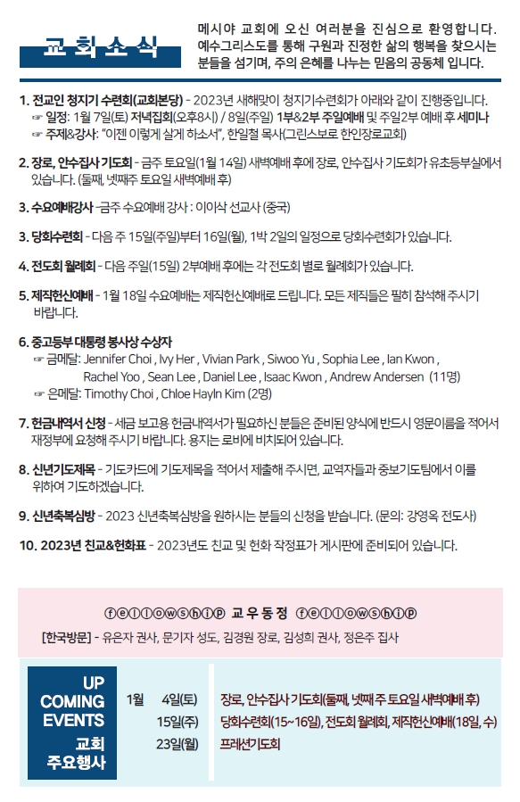Bulletin 교회주보 [2022-01-08] 주보 Author Pastor MPC Date 2023-01-07 14:14 Views 1098 Like 1 Unlike 0 Print « [2023-01-01] 주보 [2022-01-15] 주보 » List