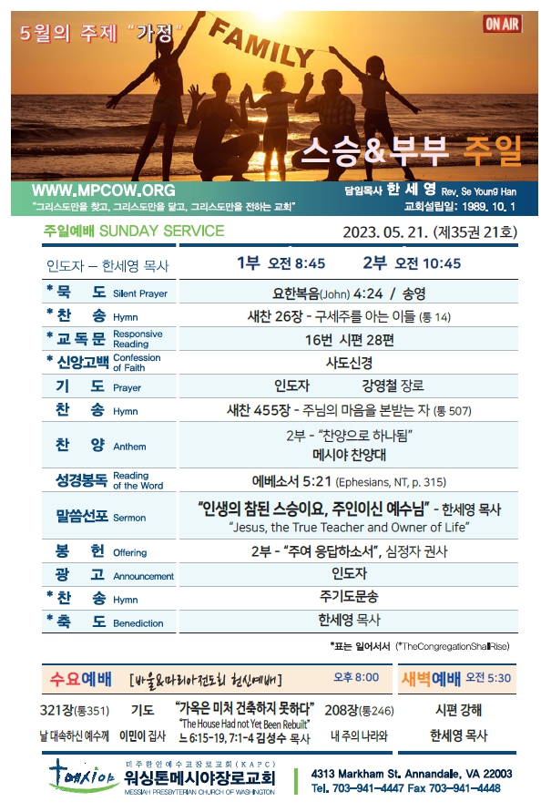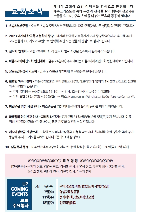 Bulletin 교회주보 [2023-05-21] 주보 Author Pastor MPC Date 2023-05-20 14:03 Views 966 Like 0 Unlike 0 Print « [2023-05-14] 주보 [2023-05-28] 주보 » List