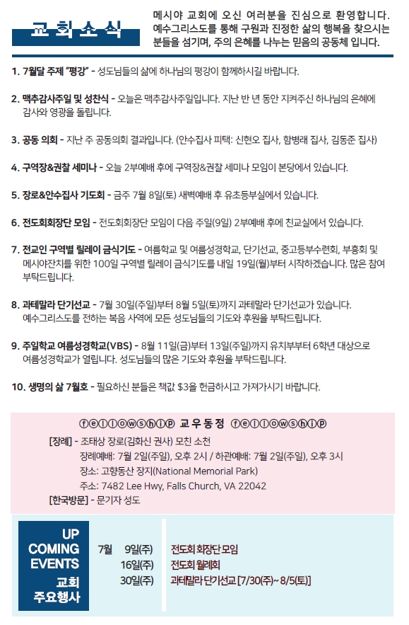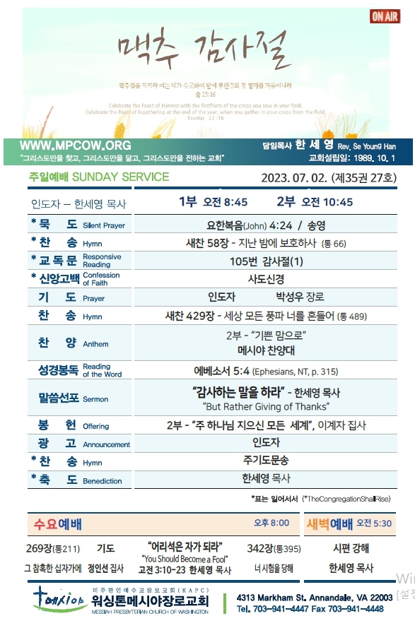 Bulletin 교회주보 [2023-07-02] 주보 Author Pastor MPC Date 2023-07-01 12:04 Views 995 Like 0 Unlike 0 Print « [2023-06-25] 주보 [2023-07-09] 주보 » List