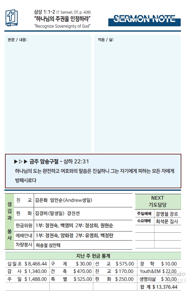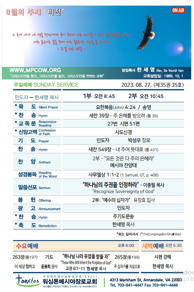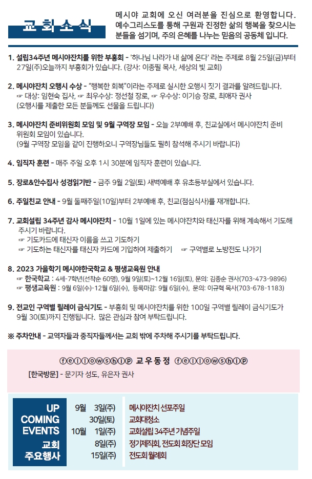 Bulletin 교회주보 [2023-08-27] 주보 Author Pastor MPC Date 2023-08-26 14:20 Views 900 Like 0 Unlike 0 Print « [2023-08-20] 주보 [2023-09-03] 주보 » List