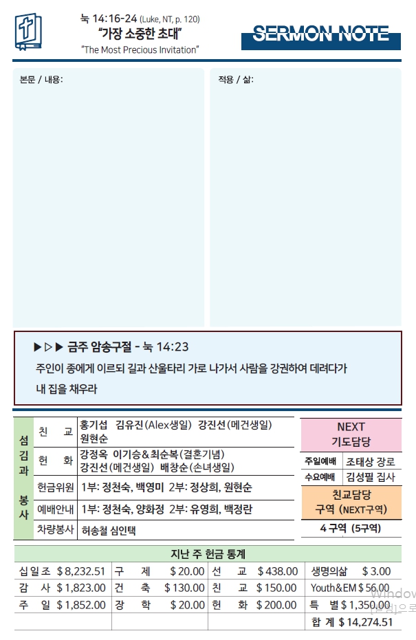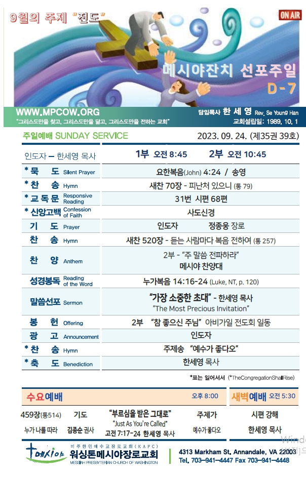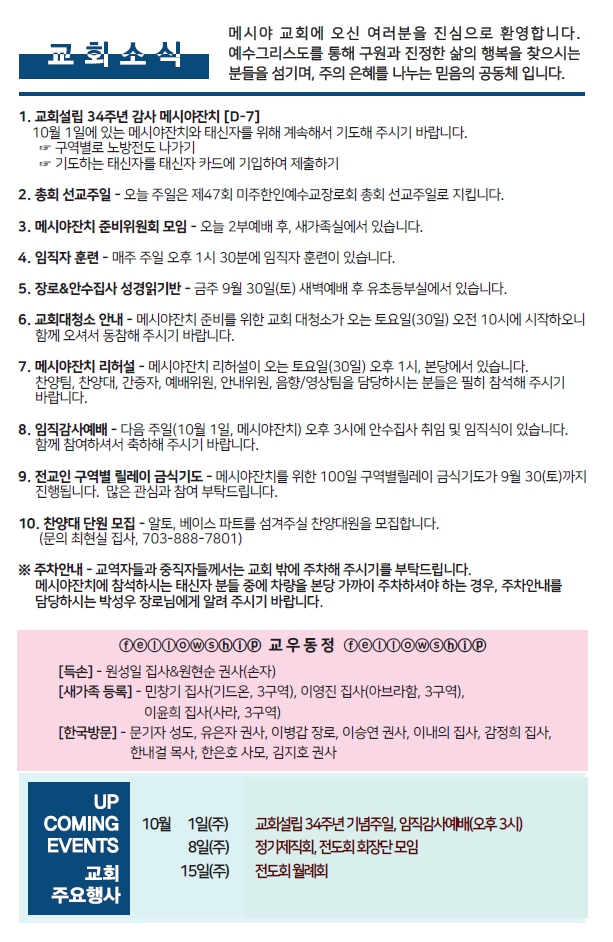 Bulletin 교회주보 [2023-09-24] 주보 Author Pastor MPC Date 2023-09-23 13:34 Views 874 Like 0 Unlike 0 Print « [2023-07-17] 주보 [2023-10-01] 주보 » List