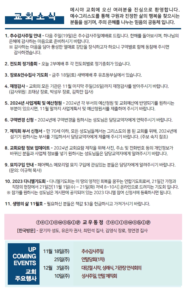 Bulletin 교회주보 [2023-11-12] 주보 Author Pastor MPC Date 2023-11-11 17:05 Views 845 Like 0 Unlike 0 Print « [2023-11-05] 주보 [2023-11-19] 주보 » List