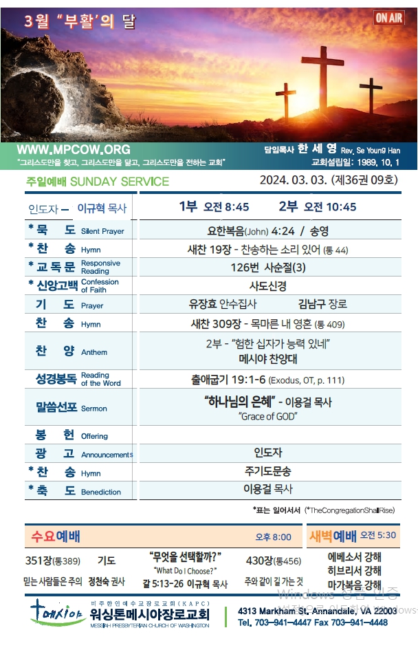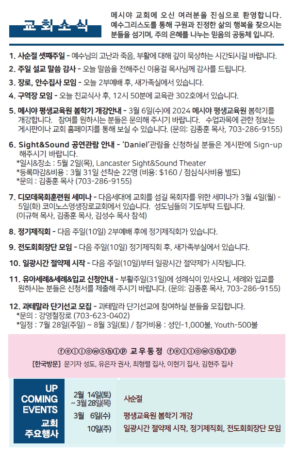 Bulletin 교회주보 [2024-03-03] 주보 Author Pastor MPC Date 2024-03-02 16:06 Views 788 Like 0 Unlike 0 Print « [2024-02-25] 주보 [2024-03-10] 주보 » List
