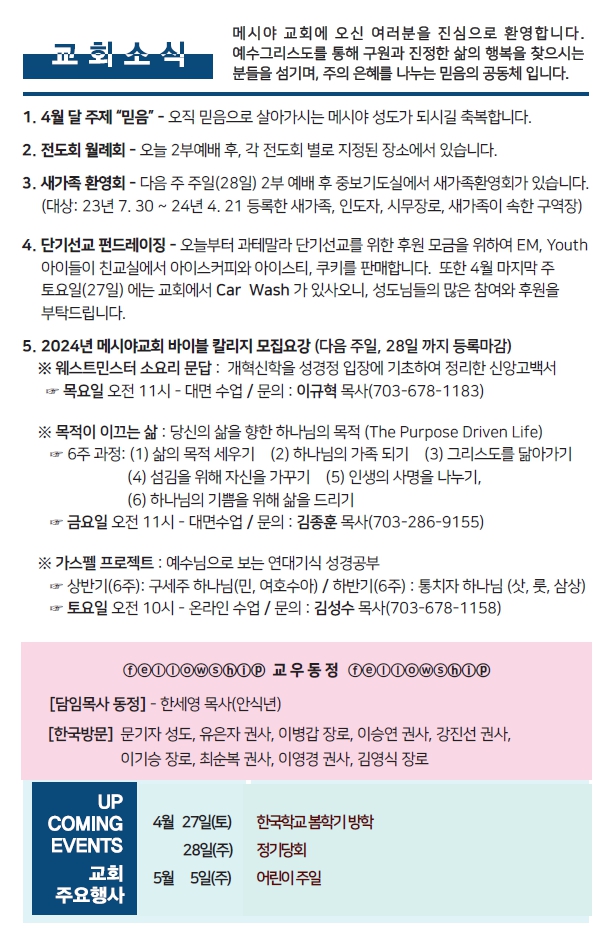 Bulletin 교회주보 [2024-04-21] 주보 Author Pastor MPC Date 2024-04-20 11:16 Views 795 Like 0 Unlike 0 Print « [2024-04-14] 주보 [2024-04-28] 주보 » List