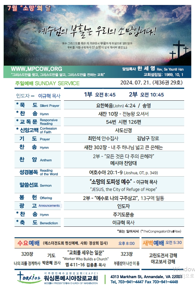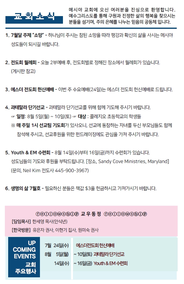Bulletin 교회주보 [2024-07-21] 주보 Author Pastor MPC Date 2024-07-20 14:34 Views 663 Like 0 Unlike 0 Print « [2024-07-14] 주보 [2024-07-28] 주보 » List