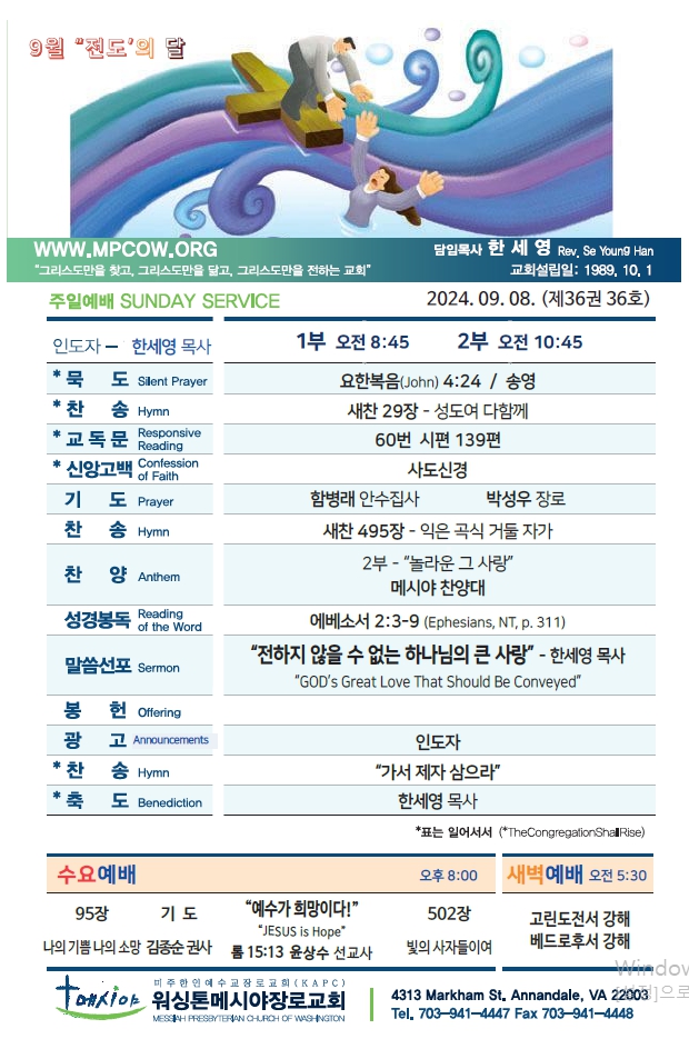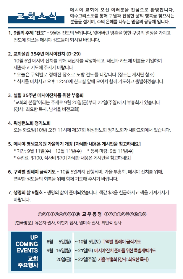 Bulletin 교회주보 [2024-09-08] 주보 Author Pastor MPC Date 2024-09-07 20:50 Views 620 Like 0 Unlike 0 Print « [2024-09-01] 주보 [2024-09-15] 주보 » List