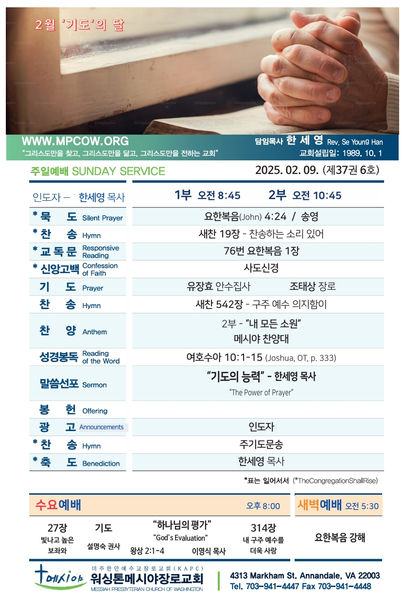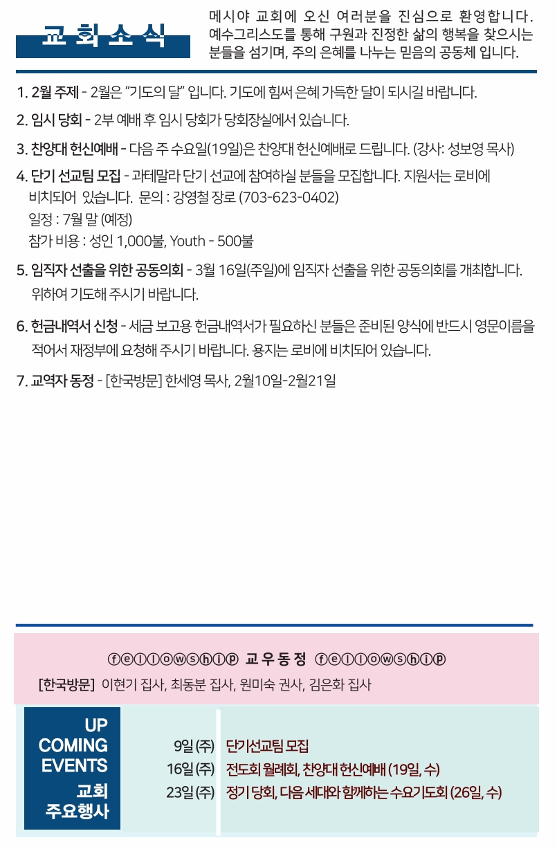 Bulletin 교회주보 [2025-02-09] 주보 Author Pastor MPC Date 2025-02-08 15:07 Views 343 Like 0 Unlike 0 Print « [2025-02-02] 주보 [2025-02-16] 주보 » List