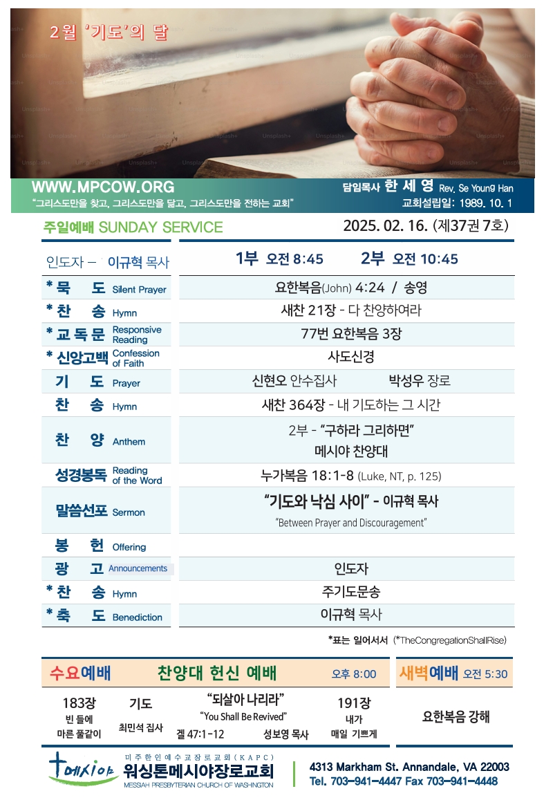 Bulletin 교회주보 [2025-02-16] 주보 Author Pastor MPC Date 2025-02-16 07:33 Views 354 Like 0 Unlike 0 Print « [2025-02-09] 주보 [2025-02-23] 주보 » List