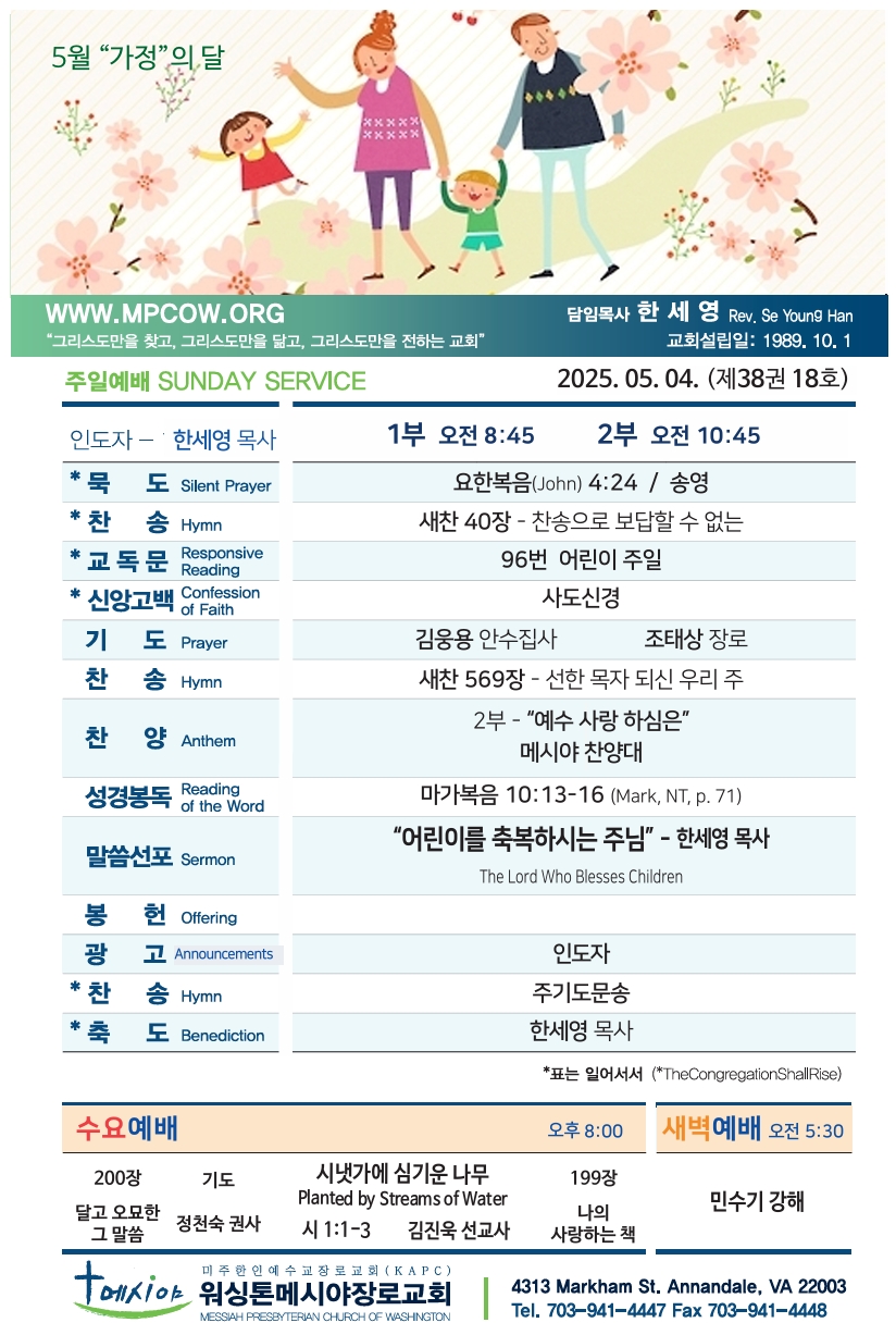 Bulletin 교회주보 [2025-05-04] 주보 Author Pastor MPC Date 2025-05-04 08:04 Views 250 Like 0 Unlike 0 Print « [2025-04-27] 주보 [2025-05-11] 주보 » List