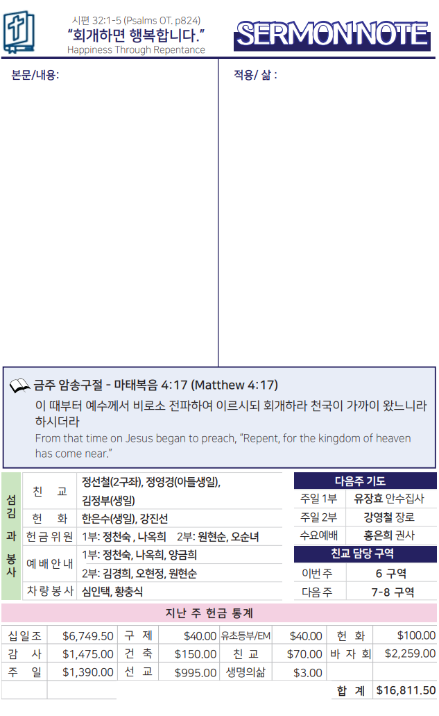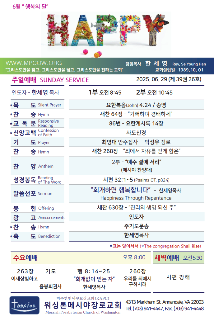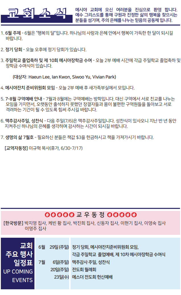 Bulletin 교회주보 [2025-06-29] 주보 Author Pastor MPC Date 2025-06-28 15:02 Views 214 Like 0 Unlike 0 Print « [2025-06-22] 주보 [2025-07-06] 주보 » List