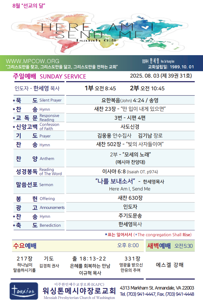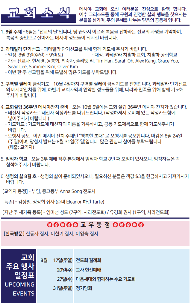 Bulletin 교회주보 [2025-08-03] 주보 Author Pastor MPC Date 2025-08-02 15:26 Views 169 Like 0 Unlike 0 Print « [2025-07-27] 주보 [2025-08-10] 주보 » List