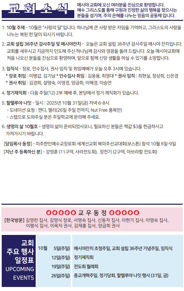 Bulletin 교회주보 [2025-10-05] 주보 Author Pastor MPC Date 2025-10-04 16:09 Views 107 Like 0 Unlike 0 Print « [2025-09-28] 주보 [2025-10-12] 주보 » List
