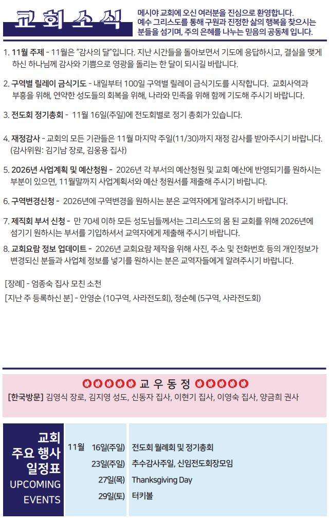 Bulletin 교회주보 [2025-11-09] 주보 Author Pastor MPC Date 2025-11-08 16:20 Views 73 Like 0 Unlike 0 Print « [2025-11-02] 주보 [2025-11-16] 주보 » List