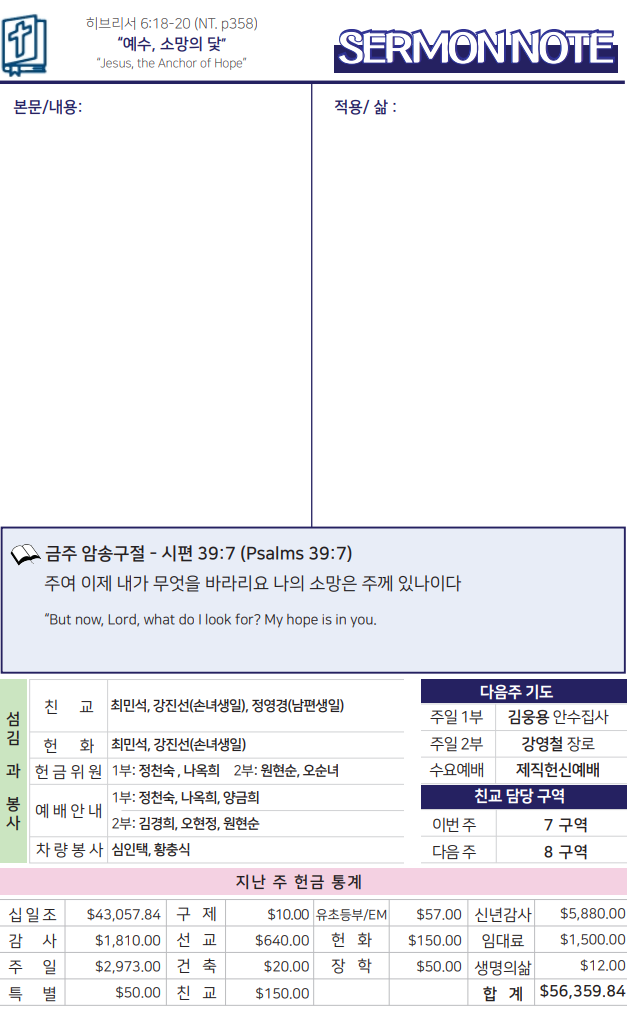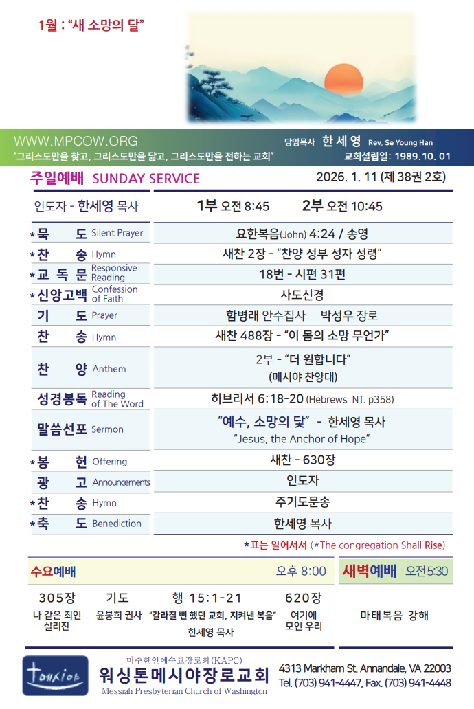 Bulletin 교회주보 [2026-01-11] 주보 Author Pastor MPC Date 2026-01-10 12:51 Views 56 Like 0 Unlike 0 Print « [2026-01-04] 주보 [2026-01-18] 주보 » List