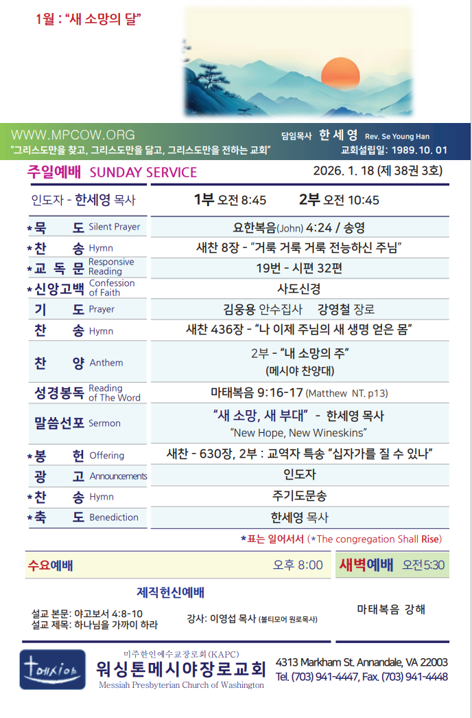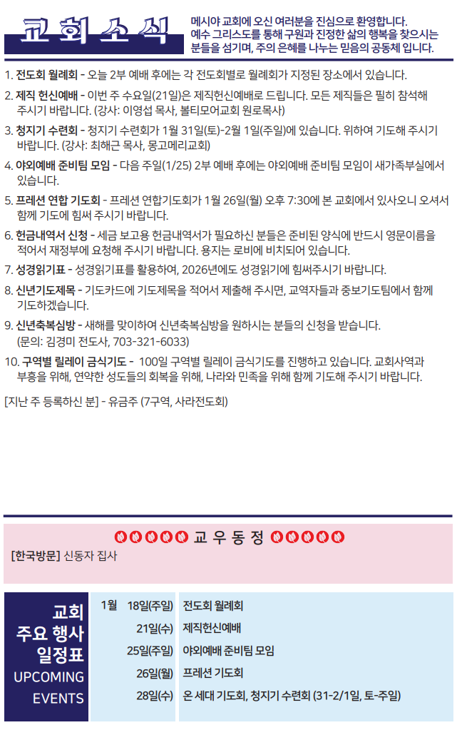 Bulletin 교회주보 [2026-01-18] 주보 Author Pastor MPC Date 2026-01-17 15:59 Views 24 Like 0 Unlike 0 Print « [2026-01-11] 주보 [2026-01-25] 주보 » List