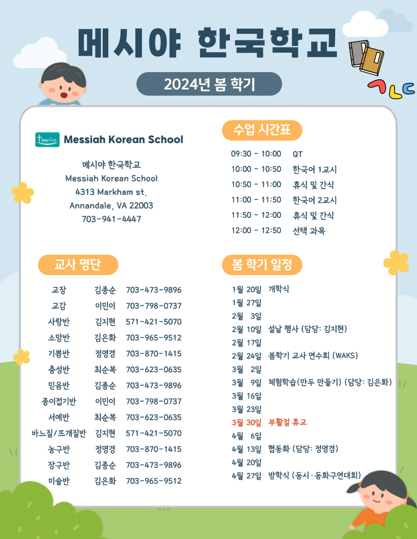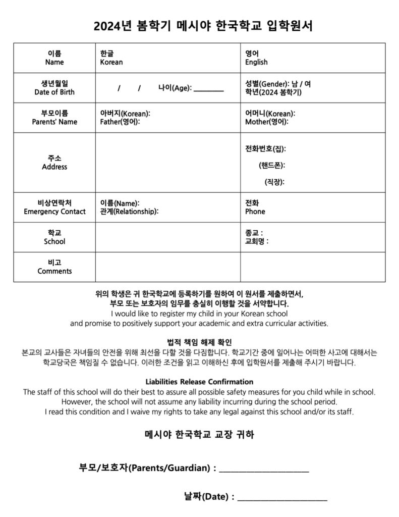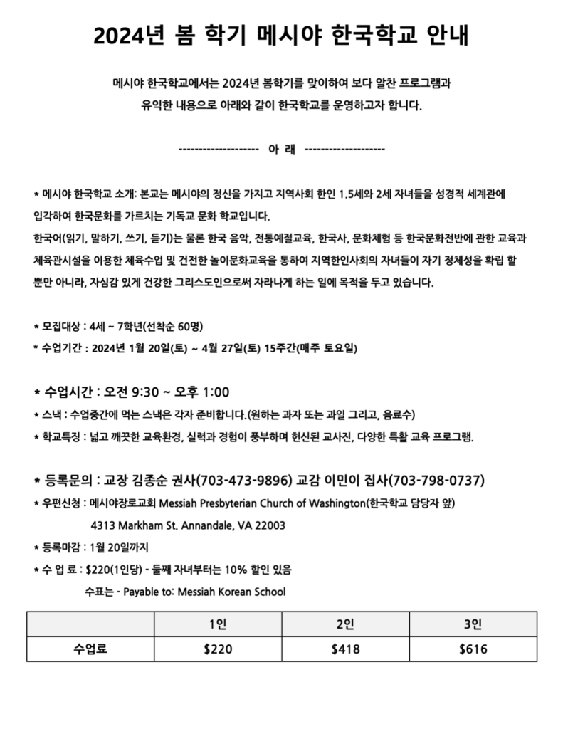 Korean school 한국학교 2024 봄학기 한국학교 입학 안내 및 입학 원서 Author admin Date 2024-01-16 17:40 Views 812 Like 0 Unlike 0 Print Slide2.png « 2023년 가을 학기 한국학교 입학안내 및 입학원서 2024 가을학기 한국학교 입학 안내 및 입학 원서 » List