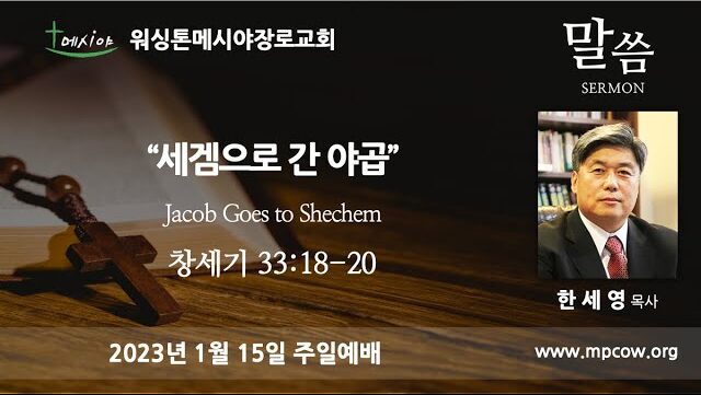 2023년 1월 15일 주일예배, 설교: 한세영 목사 창세기 33:18-20 “세겜으로 간 야곱” 예배 시간 안내 * 주일 예배 1부: 08:20 am, 2부: 09:45 am, 3부: 12:00 pm * 새벽예배: (월-금) 5:30 am, (토) 6:00 am * 수요예배: 8:00 pm 금주 주보 바로가기: https://bit.ly/35lGJCh 교회 홈페이지: https://www.mpcow.org 유투브 홈페이지: https://www.youtube.com/user/mpcoworg 온라인헌금 바로가기: https://messiah-annandale.churchcenter.com/giving 메시야장로교회는 CCLI 로부터 […]