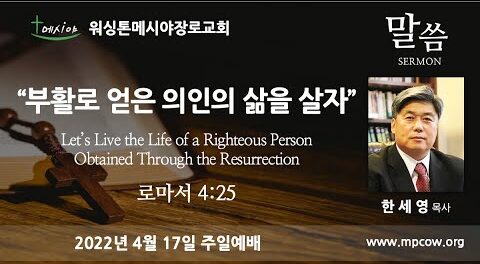 2022년 4월 17일 주일예배, 설교: 한세영 목사 로마서 4:25 “부활로 얻은 의인의 삶을 살자” 예배 시간 안내 * 주일 예배 1부: 08:20 am, 2부: 09:45 am, 3부: 12:00 pm * 새벽예배: (월-금) 5:30 am, (토) 6:00 am * 수요예배: 8:00 pm 금주 주보 바로가기: https://bit.ly/35lGJCh 교회 홈페이지: https://www.mpcow.org 유투브 홈페이지: https://www.youtube.com/user/mpcoworg 온라인헌금 바로가기: https://messiah-annandale.churchcenter.com/giving 메시야장로교회는 […]
